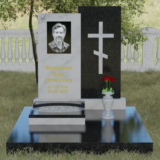 Кому подойдет: Эта модель является универсальным решением для тех, кто ищет баланс между традициями и современным дизайном. В строгом контрастном исполнении (черный и белый гранит) мемориал станет достойным памятником отцу, мужу, брату или дедушке, подчеркивая их мужество и твердость. При выборе более мягких оттенков, таких как мрамор Тассо или гранит Блю Перл, композиция приобретает нежность и светлую грусть, идеально подходя для оформления захоронения матери, жены или дочери. Это выбор людей, стремящихся выразить свою глубокую скорбь через благородную эстетику камня, которая останется неизменной для многих поколений потомков.