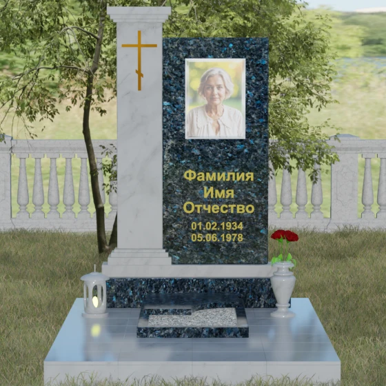 Композиция данного надгробия построена на гармоничном сочетании двух вертикальных элементов, установленных на массивное ступенчатое основание. Левая часть выполнена в виде величественной колонны с декоративным навершием в классическом стиле. На фронтальной стороне колонны расположена гравировка православного креста, покрытая сусальным золотом или имитирующим его составом, что придает мемориалу торжественный и одухотворенный вид. Правая часть — это лаконичная прямоугольная стела, предназначенная для размещения портрета и памятных надписей. Строгая геометрия линий подчеркивает внутреннюю силу и достоинство того, чья память здесь увековечена.