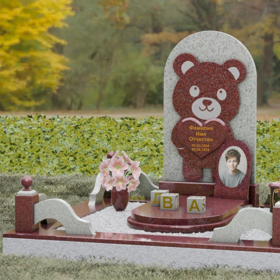 Данная мемориальная композиция представляет собой уникальное сочетание трогательной нежности и величественной непоколебимости камня. В центре художественного замысла лежит глубокий символизм: фигура медвежонка, бережно держащего в лапах сердце, олицетворяет чистоту, бесконечную родительскую любовь и защиту, которую близкие стремятся подарить даже после ухода дорогого человека. Это надгробие из натурального камня выполнено в технике художественного комбинирования различных пород, что создает потрясающий визуальный объем. Массивная светлая стела с полукруглым завершением служит идеальным фоном для темного силуэта, вырезанного с ювелирной точностью. Игра контрастов между зеркальной полировкой черного камня и благородной текстурой светлого гранита подчеркивает каждую деталь: от доброго взгляда лесного покровителя до мягких контуров его фигуры.