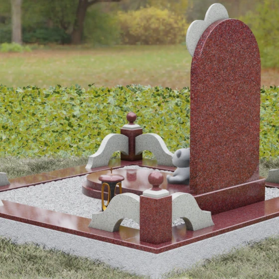 • Символические аксессуары: У подножия стелы расположена скульптура маленького медвежонка, выполненная из светлого камня с матовой фактурой, что подчеркивает невинность и чистоту души.