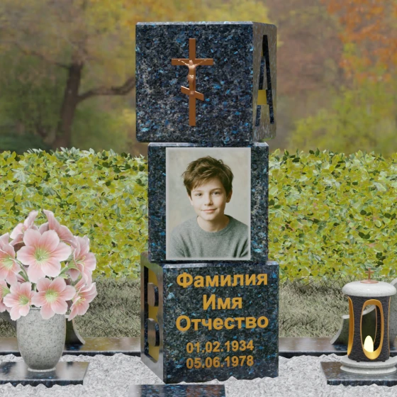 Представленное надгробие из натурального камня (Артикул: 142) — это не просто памятный знак, а монументальное архитектурное произведение, выполненное в стиле современного мемориального минимализма. В отличие от стандартных решений, данная модель представляет собой композицию из трех массивных кубических блоков, установленных друг на друга. Такая форма символизирует устойчивость, многогранность человеческой жизни и незыблемость семейного фундамента. Каждая грань камня подвергнута безупречной зеркальной полировке, которая создает глубокую игру света и отражений, подчеркивая природную чистоту материала.