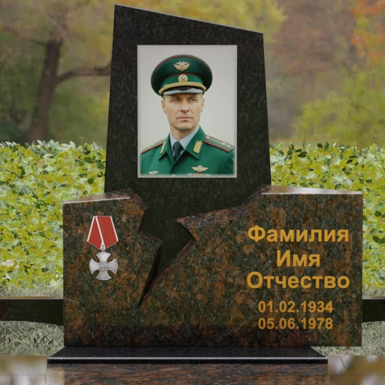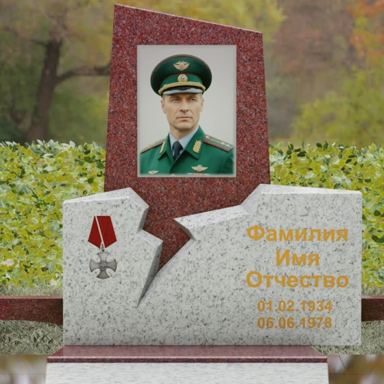 Представленная вашему вниманию величественная стела (Артикул 187) — это не просто мемориальный знак, а глубокое художественное произведение, в котором запечатлена эстетика мужества и непоколебимой воли. Композиция построена на резком, драматичном контрасте двух видов камня и сложных геометрических форм. Верхний сегмент, выполненный из глубокого черного гранита с зеркальной полировкой, устремлен ввысь, символизируя чистоту помыслов и вечный покой. Его асимметричный срез придает монументу динамику и современный вид. Нижняя часть комплекса, созданная из фактурного красно-коричневого гранита, олицетворяет земную твердь и крепость характера. Особого внимания заслуживает художественный разлом — рваная, зигзагообразная линия соприкосновения двух плит. Этот «разлом времени» выглядит максимально натуралистично, создавая визуальное ощущение мощи, способной преодолеть саму смерть. На левой стороне мемориала гордо расположена объемная резьба в виде ордена Мужества с алой лентой, что подчеркивает особый статус и заслуги усопшего.