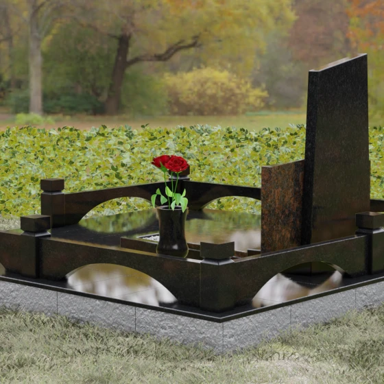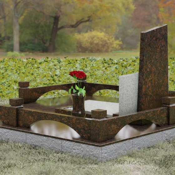 Целостность и монументальность композиции подчеркивается безупречным благоустройством участка. Мемориал установлен на массивный гранитный постамент, который переходит в сплошное мощение территории крупноформатными плитами из натурального камня. Такое решение не только создает законченный архитектурный ансамбль, но и обеспечивает исключительную долговечность конструкции, предотвращая проседание почвы и избавляя от необходимости сложного ухода. В едином стиле с основным памятником выполнены элементы декора: изящная каменная ваза для живых цветов и закрытая лампада (закрытый подсвечник) на левой стороне, чьи строгие формы идеально гармонируют с общей геометрией комплекса. Полированные до зеркального блеска грани играют на свету, создавая эффект глубины и благородного сияния.