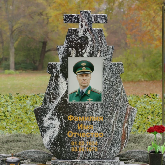 Данное ритуальное изделие приковывает взгляд своей необычной, глубоко символичной архитектурой. Силуэт стелы представляет собой сложную многоступенчатую композицию, которая плавно сужается кверху, напоминая очертания величественной часовни или лестницы, уходящей в небеса. Каждый ярус боковых граней выполнен с идеальной геометрической точностью: резкие, строгие выступы создают ритмичный рисунок, который подчеркивает статус и твердость характера усопшего. Венчает композицию лаконичный четырехконечный крест, который не просто закреплен сверху, а является монолитным продолжением самого камня, что символизирует неразрывную связь души с вечностью.