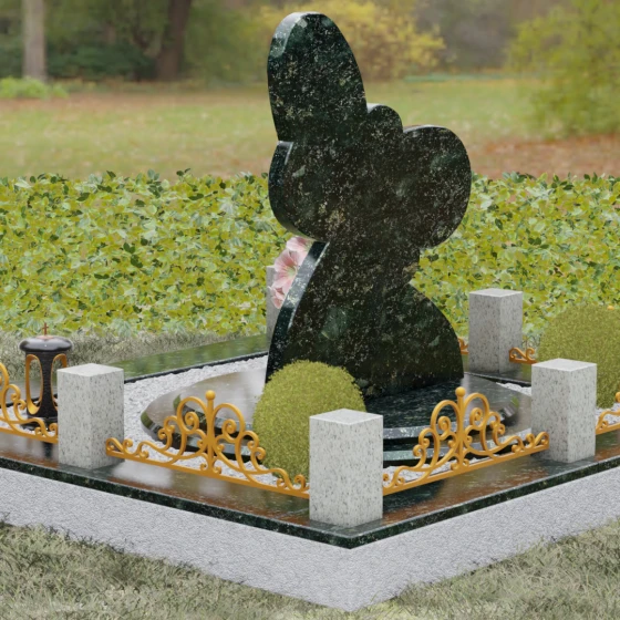 Центральным элементом композиции выступает стела, выполненная в виде стилизованного силуэта бабочки — древнего символа бессмертия души, её трансформации и освобождения. Искусствоведческий подход к дизайну прослеживается в сложной геометрии: плавные изгибы верхних и нижних крыльев создают динамичный, почти живой контур. Особое внимание уделено светотеневому рисунку. Контуры крыльев акцентированы глубокой светлой фаской, которая контрастирует с основной темной поверхностью камня. Этот прием создает эффект многослойности и объема, заставляя грани «играть» при изменении угла освещения, словно бабочка готова к полету в вечность.