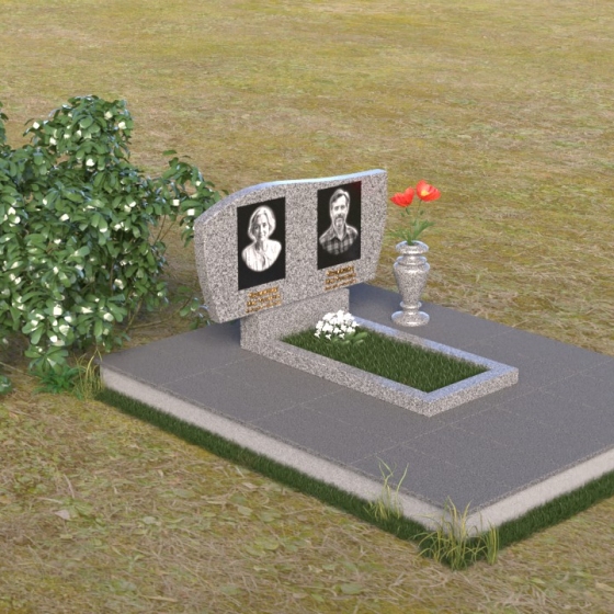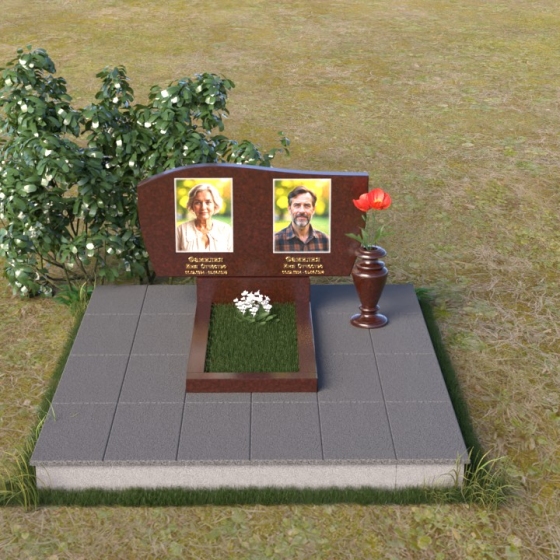Этот памятник являет собой образец мастерства в обработке камня. Особое внимание привлекает игра контрастов: зеркально отполированный гранит, отражающий небо и окружающий мир, и деликатно выгравированные портреты усопших. Лаконичная ваза, выполненная в том же стиле, что и стела, гармонично дополняет композицию и служит местом для живых цветов, символизирующих вечную память и любовь.