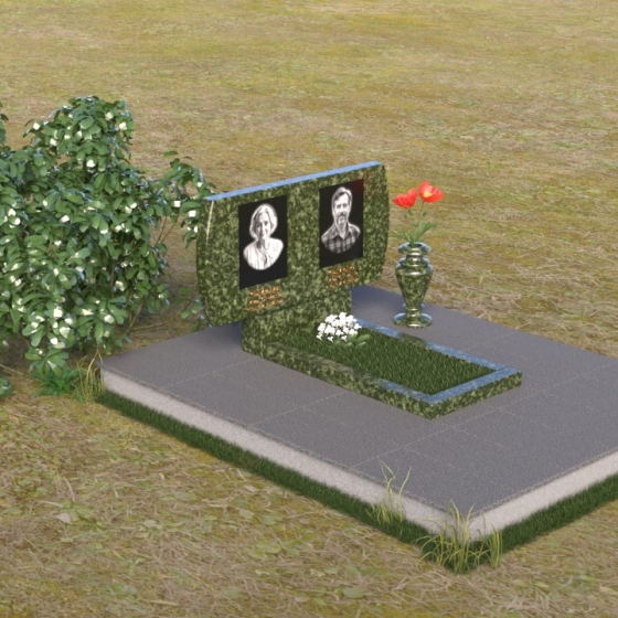 Композиция памятника строится на контрасте строгих геометрических форм и плавных линий, создавая гармоничный и запоминающийся образ. В верхней части возвышается стела из черного гранита, чья зеркальная полировка отражает небо и окружающий мир, словно напоминая о связи земного и небесного. Верхние углы стелы скруглены, смягчая строгость формы и придавая ей более мягкий, человечный облик. На стеле размещены портреты усопших, выполненные с высокой точностью и передающие их индивидуальность. Золотистые надписи имен и дат словно светятся на фоне черного камня, добавляя торжественности и значимости. У подножия стелы располагается горизонтальная плита, также выполненная из полированного черного гранита, создающая ощущение завершенности и устойчивости. Рядом – изящная ваза из того же материала, предназначенная для живых цветов, символа неувядающей памяти и любви.