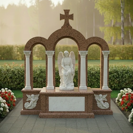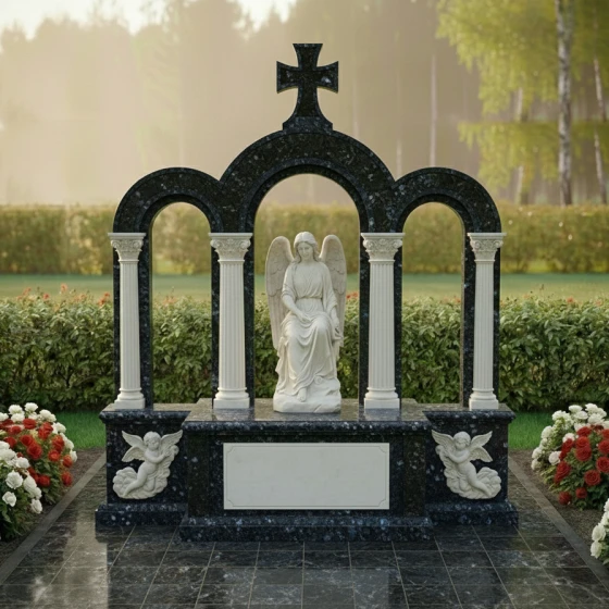 Кому подойдет: Эта мемориальная композиция идеально подойдет для тех, кто ищет не просто надгробный знак, а настоящее произведение мемориального искусства, способное выразить глубокую скорбь и вечную любовь. Она станет достойным воплощением памяти о человеке, чья жизнь была наполнена светом, верой и достоинством. Величественная аркада, символизирующая переход в иной мир, и фигура ангела, олицетворяющая чистоту души, делают эту композицию идеальным выбором для увековечения памяти о близком человеке, чья жизнь оставила неизгладимый след. Мемориальная композиция ПН 044 доступна для заказа в 8 цветовых решениях, что позволяет подобрать материал, наиболее точно отражающий характер и индивидуальность усопшего. Вы можете выбрать один из семи видов гранита: гранит Амфиболит с его глубоким черным цветом, величественный Балтик Грин, благородный Блю Перл, классический Габбро-диабаз, теплый Дымовский, изысканный Лезниковский или светлый Мансуровский. Также доступен мрамор Тассо, который придаст композиции особую нежность и утонченность. Такой широкий выбор материалов дает возможность создать по-настоящему уникальный и персонализированный мемориал, созвучный духу и памяти усопшего.