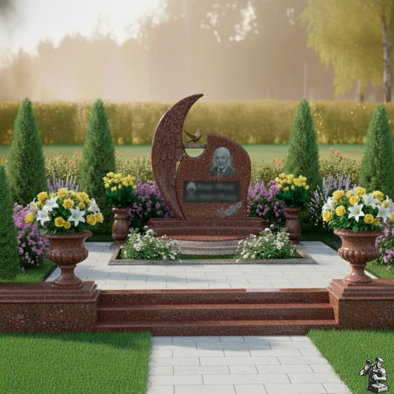 Дизайн этого гранитного монумента глубоко символичен. Форма, напоминающая ангельское крыло, олицетворяет покой, защиту и вечное упокоение души под сенью небесной благодати. Голубь, расположенный на вершине, традиционно ассоциируется с миром, надеждой и чистотой души, что делает эту композицию особенно проникновенной. Общая пластика форм, с ее плавными изгибами и мягкими линиями, создает ощущение умиротворения и безмятежности. Этот мемориал становится не просто обозначением места захоронения, а настоящим произведением искусства, выражающим глубокую любовь, уважение и стремление сохранить светлую память о человеке на долгие века.
