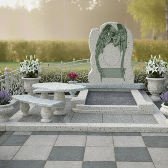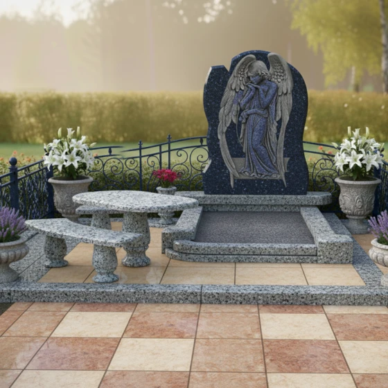 Форма стелы с ее арочным силуэтом и центральным резным изображением скорбящего ангела предоставляет широкие возможности для размещения портрета усопшего. Наиболее гармонично портрет будет смотреться в верхней части стелы, над фигурой ангела, или же в центральной части, если изображение ангела будет смещено вниз или выполнено в виде барельефа. Зеркальная полировка поверхности идеально подходит для высококачественной гравировки портрета и эпитафии, обеспечивая четкость линий и долговечность изображения. Благодаря гладкой поверхности камня, портрет будет выглядеть максимально выразительно, а отражающая способность полировки придаст ему особую глубину и объем. Выбор шрифта для эпитафии также играет важную роль: классические, строгие шрифты подчеркнут серьезность и торжественность момента, в то время как более изящные и каллиграфические могут добавить нотку индивидуальности. Этот мемориальный комплекс — это не просто камень, это архитектурное произведение, призванное сохранить светлую память о человеке и стать местом утешения для близких. Он станет вечным свидетельством любви и уважения, воплощенным в прочном и прекрасном материале.