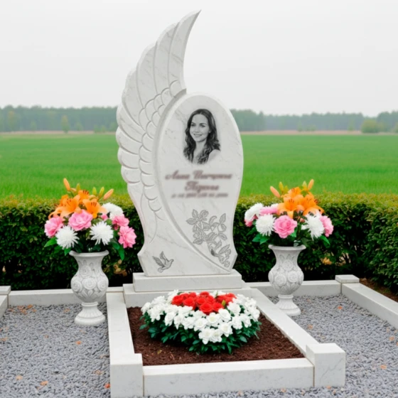 Кому подойдет: Этот мемориальный комплекс идеально подойдет для тех, кто ищет не просто памятник, а уникальное произведение искусства, способное глубоко и трогательно выразить светлую память о близком человеке. Его плавные, обтекаемые формы и символика крыла делают его особенно подходящим для увековечивания памяти о женщинах, чья жизнь была наполнена нежностью, грацией и духовностью. Мемориал станет достойным символом вечного покоя и возвышенной памяти, отражая индивидуальность и значимость ушедшего. Возможность выбора из 8 цветовых решений — 7 видов гранита (гранит амфиболит, гранит Балтик грин, гранит Блю Перл, гранит Габбро-диабаз, гранит Дымовский, гранит Лезниковский, гранит Мансуровский) и 1 вид мрамора (мрамор Тассо) — позволяет подобрать камень, который наиболее точно соответствует характеру и предпочтениям усопшего, создавая по-настоящему персонализированный и глубоко символичный мемориал.