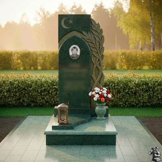 Центральная стела, выполненная в форме вертикального прямоугольника с выразительными асимметричными элементами, сразу привлекает внимание. Ее левая грань обработана с идеальной полировкой, создавая зеркальную поверхность, в которой отражается окружающий мир, символизируя бесконечность бытия. В верхней части стелы расположен изящный полумесяц со звездой, вырезанный с особой тщательностью, что придает памятнику глубокий религиозный смысл и подчеркивает индивидуальность усопшего. Ниже этого символа, в углублении, напоминающем стрельчатую арку, помещена овальная фотокерамика с портретом, обрамленная тонким рельефным кантом, что придает изображению особую значимость и защищенность.