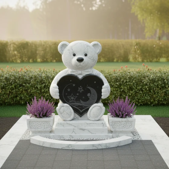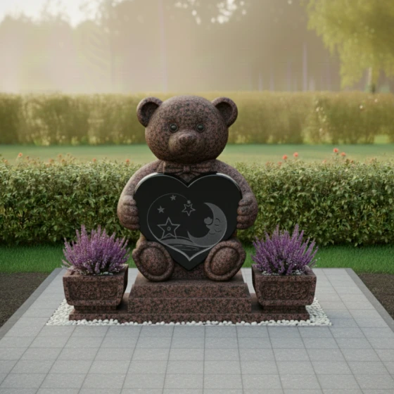 Центральным элементом композиции является изваяние в форме милого плюшевого медвежонка, выполненное из тёмного камня. Каждая деталь медвежонка проработана с удивительной тщательностью: от округлых ушек и лапок до фактурной имитации шерсти, которая придаёт фигуре мягкость и одухотворённость, несмотря на твёрдость материала. Медвежонок держит в лапках сердце — универсальный символ любви, которое становится своеобразным порталом в мир воспоминаний. На поверхности сердца выгравированы звёзды и полумесяц, создающие атмосферу тихой ночи, полной светлых грёз и нежности. Эти небесные мотивы придают композиции дополнительный символизм, напоминая о вечности души и бесконечности любви.