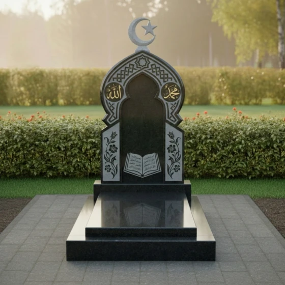 Ритуальное изделие артикула ПН 510 представляет собой глубокое художественное осмысление вечности и памяти, воплощенное в камне. Это не просто надгробие, а целая архитектурная форма, призванная стать молчаливым свидетельством уважения и любви. Центральная стела, выполненная в глубоком черном цвете, символизирует безмятежность и покой, а ее очертания напоминают величественный вход в священное пространство. Верхняя часть стелы увенчана исламским полумесяцем со звездой, выполненным из светлого камня, что создает выразительный контраст и придает композиции духовную значимость.