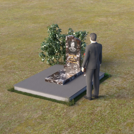 Геометрия модели продумана до мельчайших деталей. Начиная с основания, мы видим широкую плиту, обеспечивающую устойчивость всей конструкции. На ней возвышается горизонтальная плита меньшего размера, выполненная в зеркальной полировке, отражающая небо и окружающий мир, словно запечатлевая в себе мгновения жизни. Вертикальная стела, возвышающаяся над плитой, имеет сглаженные углы и плавные переходы, смягчающие строгость формы. Верхняя часть стелы, с ее деликатными сколами, придает ей уникальность и неповторимость. Рядом со стелой располагается небольшая ваза, выполненная в том же стиле, предназначенная для живых цветов, символизирующих вечную память и любовь.
