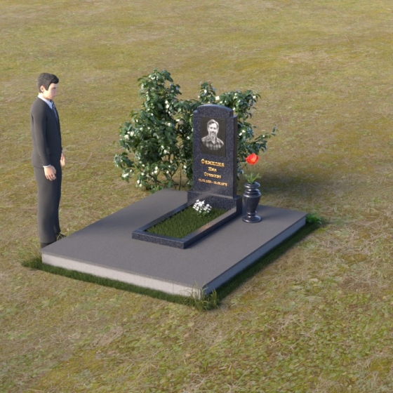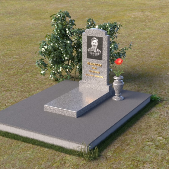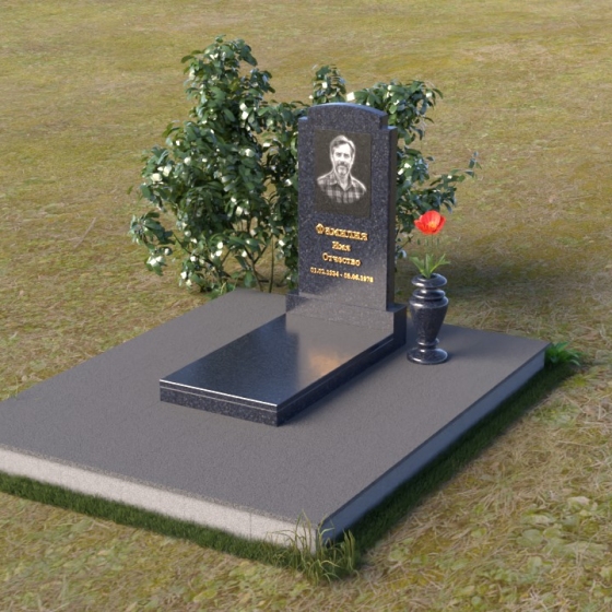Основной акцент в этой модели сделан на контрасте фактур. Зеркальная полировка черного гранита Габбро-диабаз, из которого выполнена стела, создает эффект бесконечности, отражая небо и окружающий мир. На этом фоне особенно выразительно смотрится гравировка портрета и надписи, выполненные с ювелирной точностью. Нижняя часть стелы, переходящая в горизонтальную плиту, также выполнена из черного гранита, но уже с матовой обработкой, что придает композиции дополнительную глубину и текстуру. Рядом располагается ваза из того же гранита, выполненная в классическом стиле, предназначенная для живых цветов, которые станут символом памяти и любви.