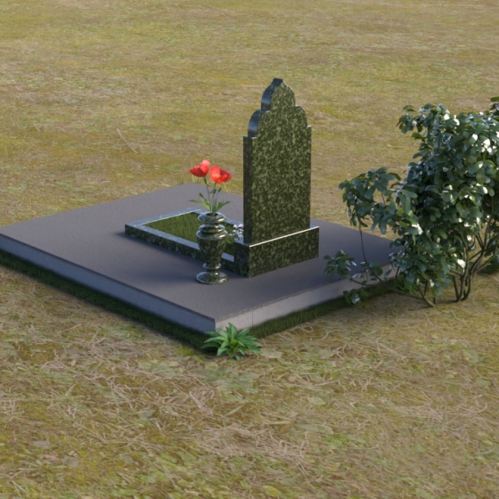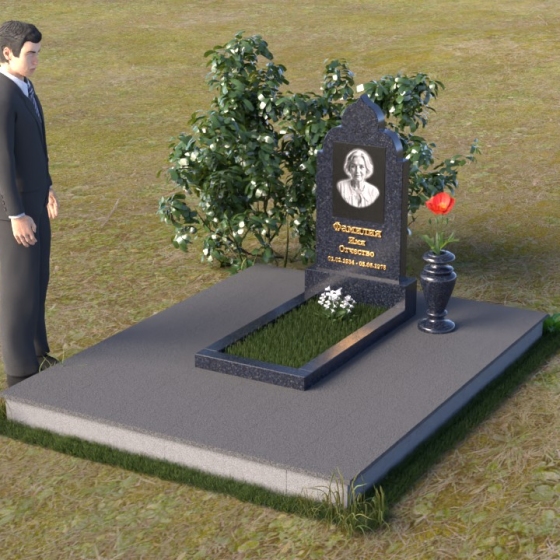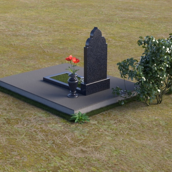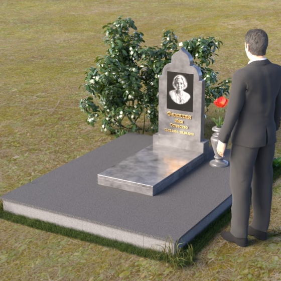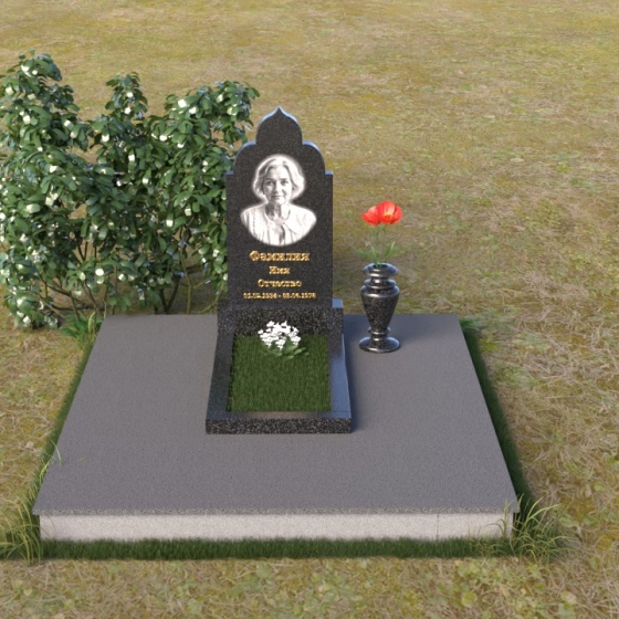 Основание композиции – прямоугольная плита с ровной, матовой поверхностью, обеспечивающая надежную устойчивость всей конструкции. На ней располагается горизонтальная плита, выполненная в виде усеченного параллелепипеда с зеркально отполированной поверхностью. Эта плита создает эффект глубины и отражает окружающий мир, словно запечатлевая моменты жизни ушедшего. Вертикальная стела возвышается над горизонтальной плитой, ее верхняя часть выполнена в форме изящной арки с плавными изгибами. Арка завершается небольшим декоративным элементом, напоминающим купол, что придает памятнику особую выразительность и духовность.