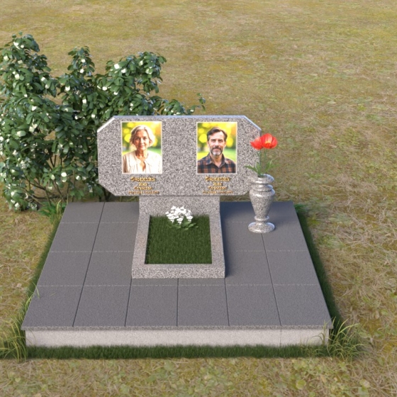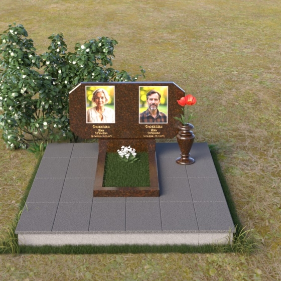 Композиция памятника строится на контрасте строгих геометрических форм и плавных линий, символизирующих жизненный путь и обретение покоя. Стела имеет форму, близкую к прямоугольнику, но с элегантно скошенными углами, смягчающими ее строгость. Верхняя часть стелы имеет две небольшие грани, словно фацеты драгоценного камня, добавляющие ей изысканности. Поверхность камня отполирована до зеркального блеска, что подчеркивает глубину черного цвета и создает ощущение торжественности. На лицевой стороне размещены портреты усопших, выполненные с высокой степенью детализации. Ниже портретов выгравированы надписи, выполненные строгим шрифтом. Справа от стелы установлена небольшая ваза, выполненная в том же стиле, что и памятник, и украшенная простым, но элегантным орнаментом.