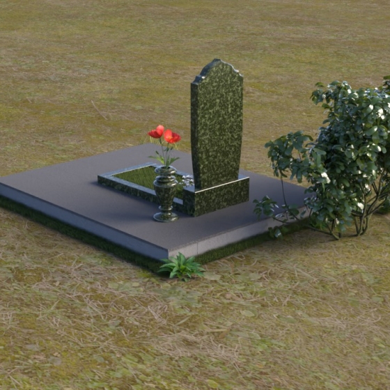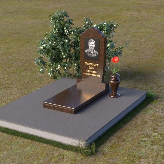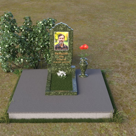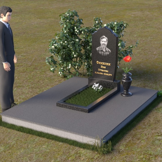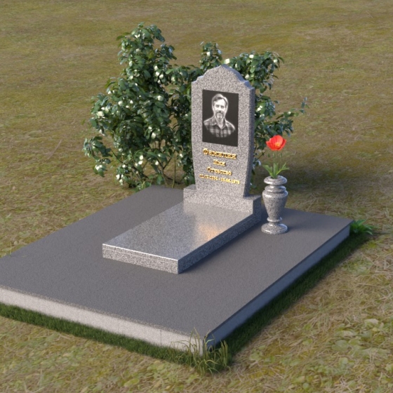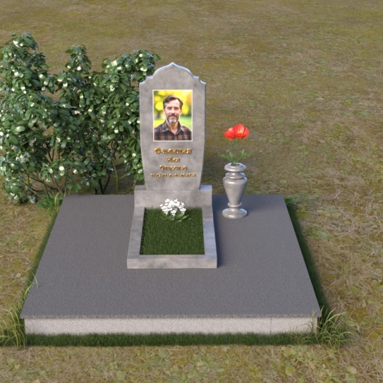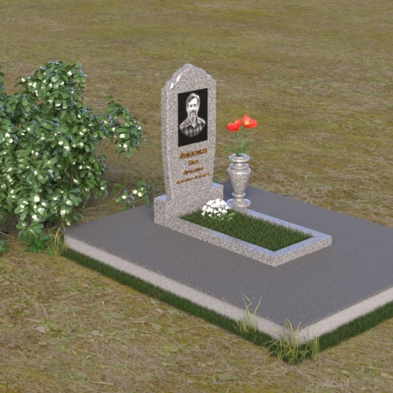 Надгробие из натурального камня ПВ 061 представляет собой элегантную композицию, сочетающую в себе строгость линий и плавные изгибы. Основная стела имеет форму, напоминающую стилизованную арку, с мягкими, скругленными плечами. Верхняя часть стелы украшена деликатными выемками, создающими эффект благородной старины. Боковые грани стелы тщательно отполированы, что придает памятнику законченный и респектабельный вид. Нижняя часть стелы переходит в прямоугольное основание, на которое устанавливается горизонтальная плита. Эта плита, выполненная в зеркальной полировке, отражает небо и окружающий ландшафт, создавая ощущение легкости и воздушности. Фаски на плитах аккуратно сняты, подчеркивая геометрию форм. Сбоку от основной стелы располагается небольшая ваза, выполненная в том же стиле и из того же материала, что и памятник. Ее изящная форма добавляет композиции завершенность и позволяет разместить живые цветы, символизирующие вечную память.